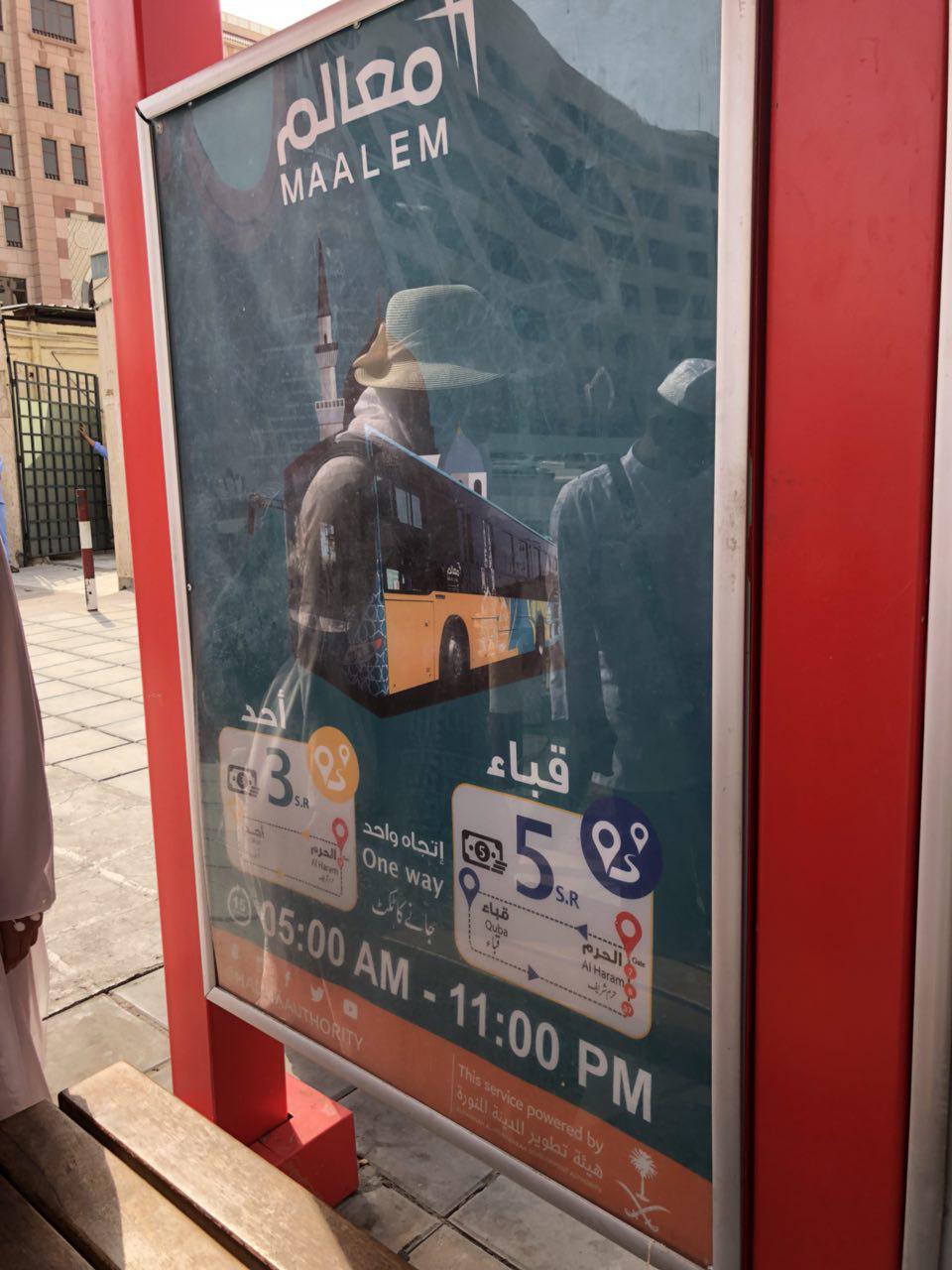 Caranya mudah, anda hanya perlu ke gate no 7 (gate bab Salam) berhampiran Masjid Ali bin Abi Tholib. Di sana ada shuttle bus bernama Maalem (warna hijau seperti dalam gambar) ke Masjid Quba’ setiap hari. Bas bergerak setiap 15 minit.